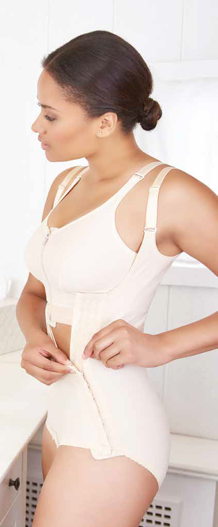 Marena Recovery bietet ein exklusives und patentiertes Gewebe in allen Kompressions-miedern und BHs, damit Sie sich sicher erholen können.